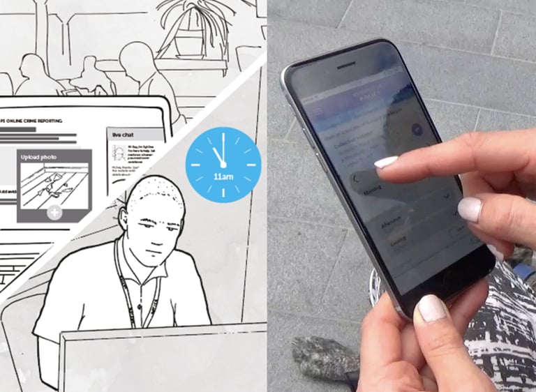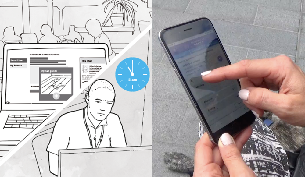 planning and facilitating focus groups, conducting depth interviews, analysing police processes, creating concept storyboards, prototypes, and moderating lab and guerrilla user testing.