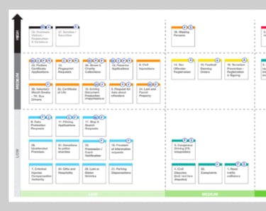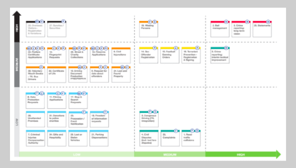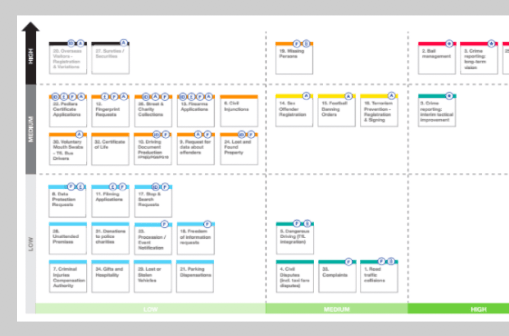 At the time, a lot of police services required a trip to a police station. Our research to date was pointing in the direction of digitisation - bringing services online and allowing people access at their convenience. We doubled down to analyse each process, the value it was delivering to the public and the volume of current demand for it. We plotted them on matrices to create a roadmap for digitisation.